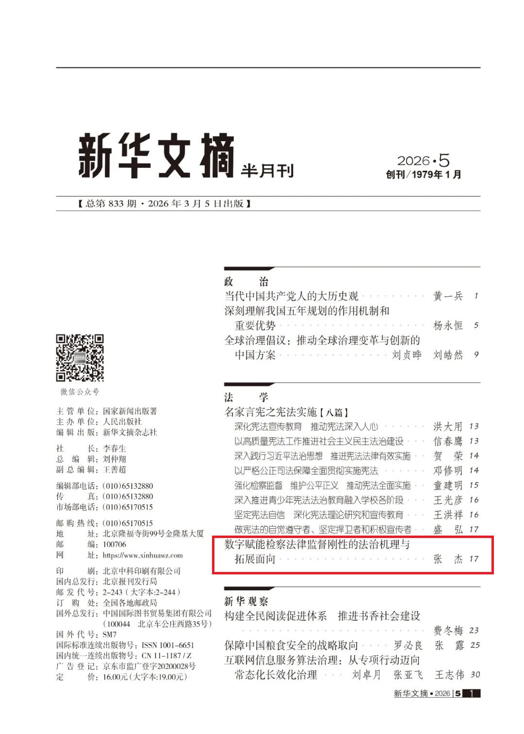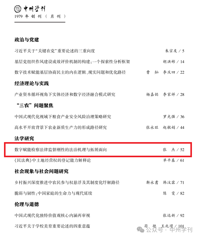 近日,600全讯白菜网址数字法治研究院院长、博士生导师张杰教授的论文《数字赋能检察法律监督刚性的法治机理与拓展面向》,获《新华文摘》2026年第5期全文转载。