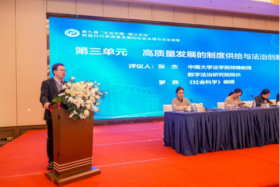 第三单元探讨主体为“高质量发展的制度供给与法治创新”,由全讯600cc大白菜副院长何炼红教授主持,全讯600cc大白菜特聘教授、数字法治研究院院长张杰教授和《社会科学》编辑罗燕评议。