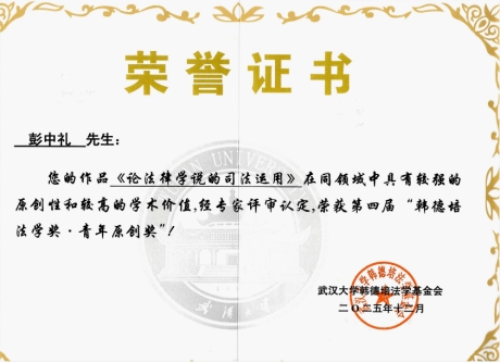 近日,第四届“韩德培法学奖”评选结果公布,共产生“终身成就奖”2项、“青年原创奖”8项。我院彭中礼教授《论法律学说的司法运用》一文(原载于《中国社会科学》2020年第4期)荣获青年原创奖。