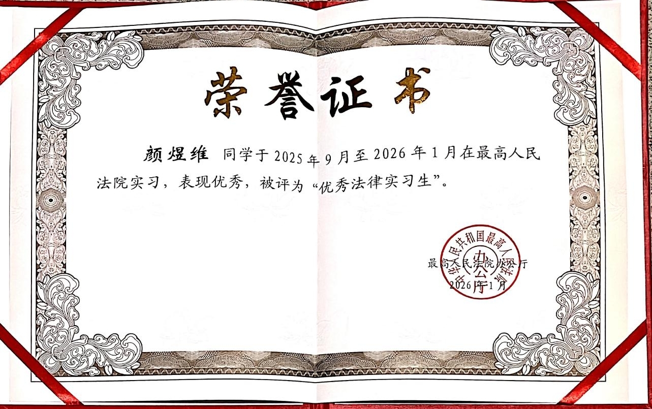 实习期间,颜煜维同学严格遵守最高人民法院各项规章制度,展现出优秀的综合能力和法学素养,以优秀表现获得实习单位的高度肯定。这是我院近年来推进个性化人才培养实现学生综合素质提升的表现。今后,我院将继续坚持以习近平新时代中国特色社会主义思想为指导,深入贯彻习近平法治思想,创新人才培养体制机制,优化人才培养路径,深化与司法实践机关之间的交流合作形式,为更高水平法治人才培养贡献力量。