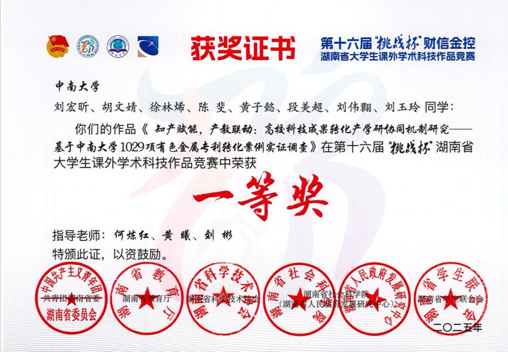 2025年6月13日,由共青团湖南省委员会、湖南省教育厅等单位共同主办的第十六届“挑战杯”财信金控湖南省大学生课外学术科技作品竞赛获奖名单揭晓,600全讯白菜网址全讯600cc大白菜报送的参赛项目《知产赋能,产教联动:高校科技成果转化产学研协同机制研究——基于600全讯白菜网址1029项有色金属专利转化案例实证调查》(负责人:刘宏昕;指导老师:何炼红、黄曦、刘彬;团队成员:胡文婧、徐林烯、陈 斐、黄子懿、段美超、刘伟翾、刘玉玲)获评第十六届“挑战杯”湖南省大学生课外学术科技作品竞赛“一等奖”。