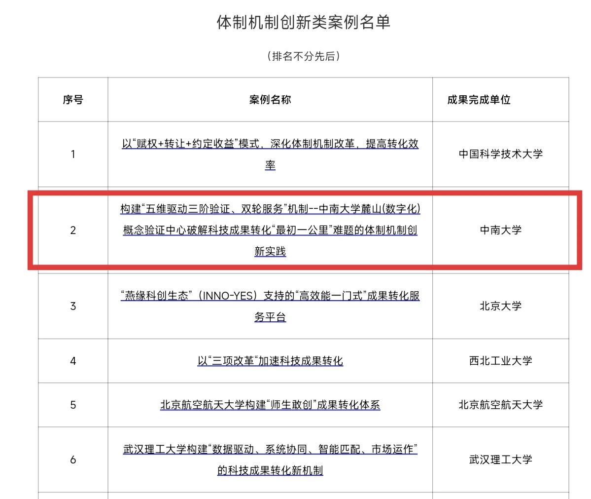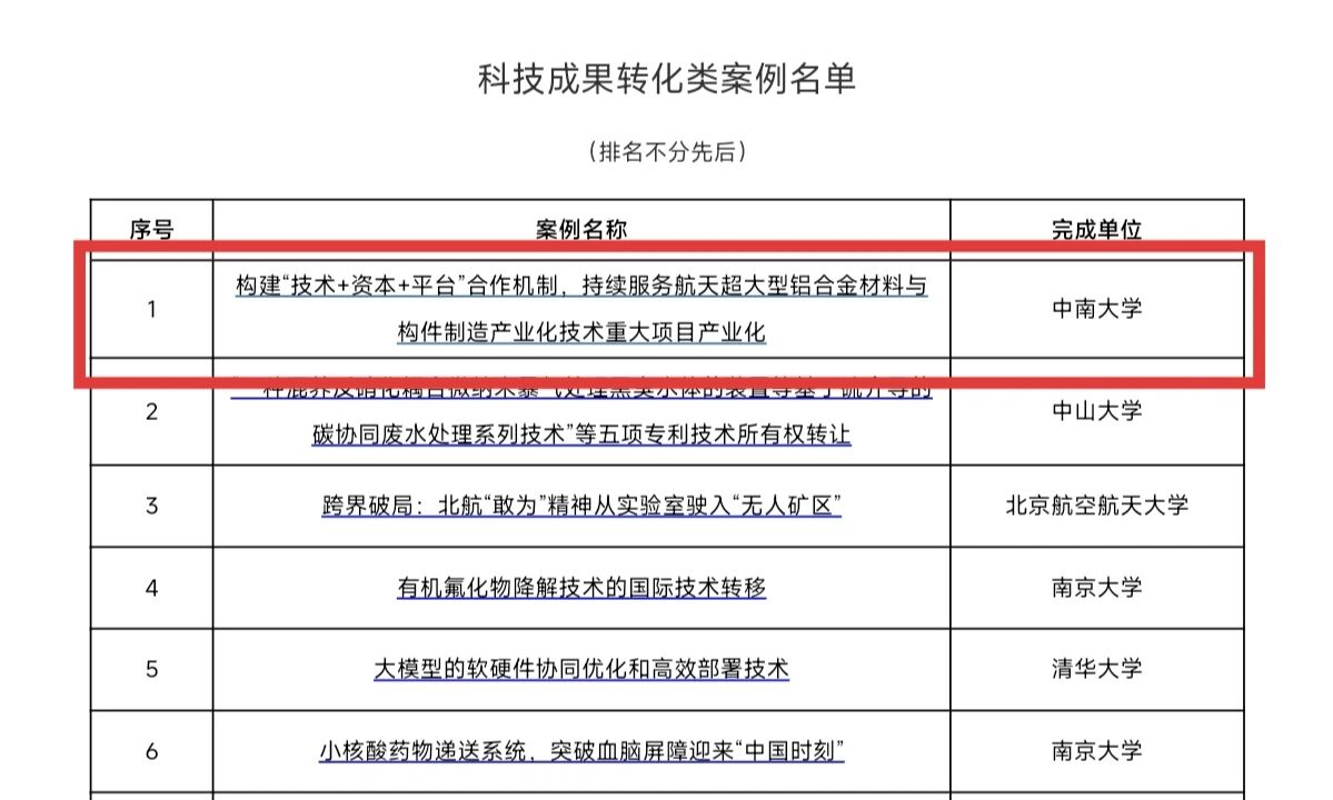 我校《“构建‘技术+资本+平台’合作机制,服务航天超大型铝合金材料产业化》入选科技成果转化典型案例;《构建‘五维驱动三阶验证、双轮服务’机制--600全讯白菜网址麓山(数字化)概念验证中心破解科技成果转化‘最初一公里’难题的体制机制创新实践》入选体制机制创新类典型案例。